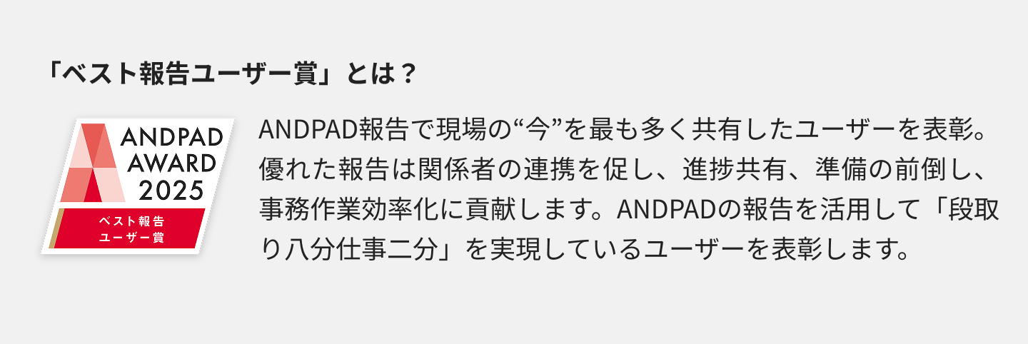 ANDPADの利用状況をデジタルにスコアリングし、最も活用度の高いユーザーを表彰するANDPAD AWARDのユーザー部門。ANDPADの報告機能を最も活用したユーザーに贈る「ベスト報告ユーザー賞」で第3位を受賞した、第一企業中央株式会社 業務部の佐々木道さんにお話を伺った。