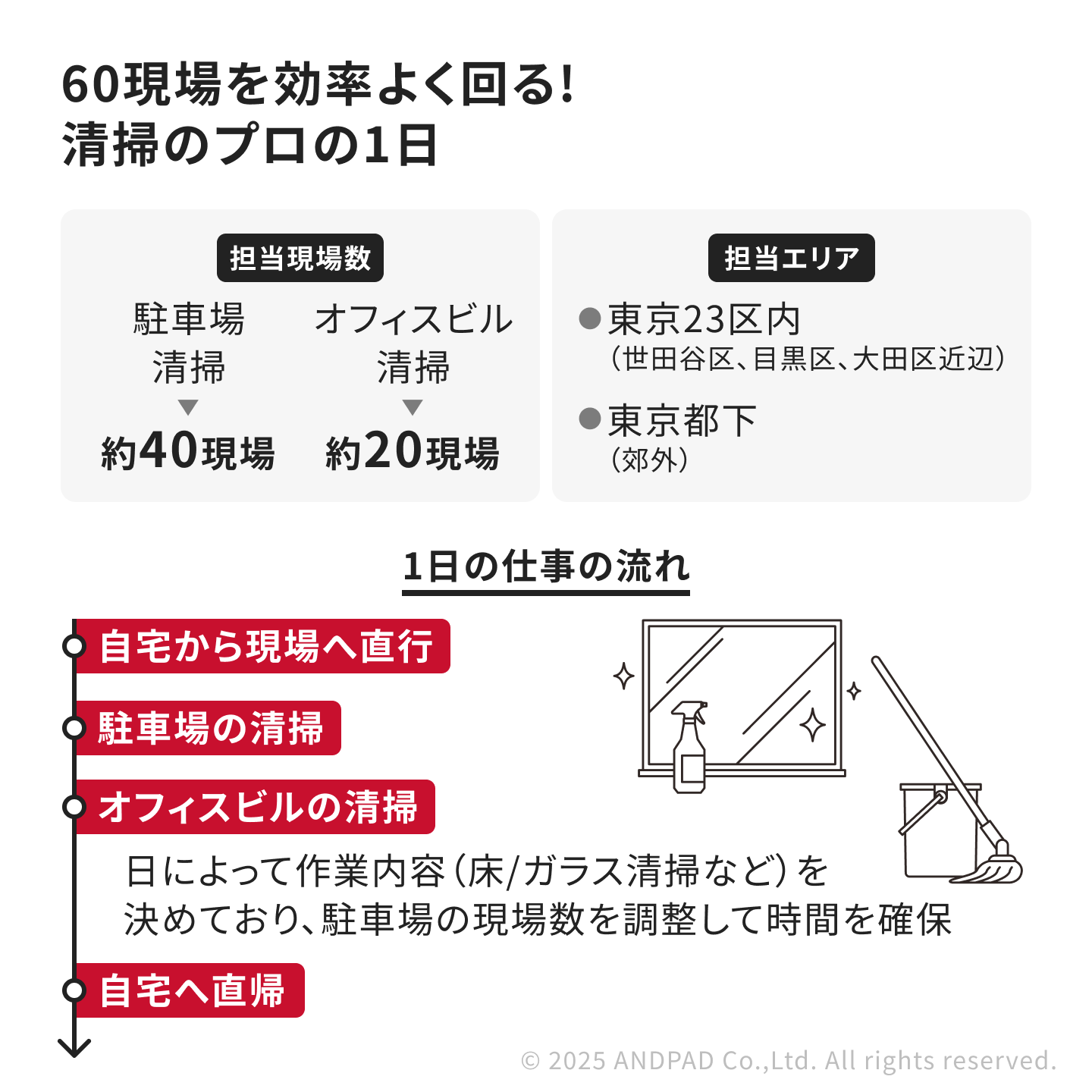 佐々木さん: 私が担当している現場は、23区内では世田谷区、目黒区、大田区近辺、あとは郊外の東京都下が中心です。清掃道具を積んだ車で移動しています。