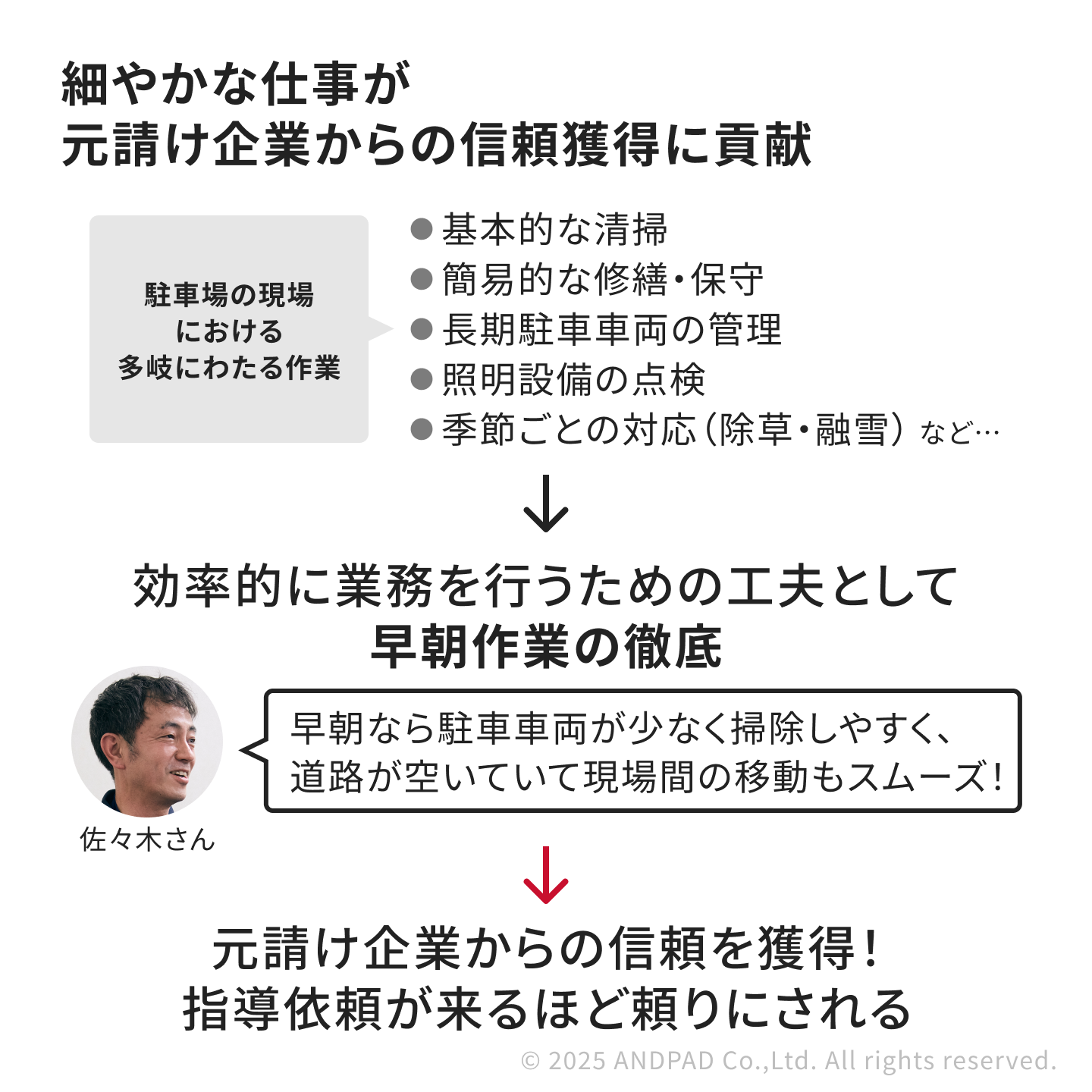 細川さん: 佐々木さんは真面目で、安心して仕事を任せられる方だと感じています。駐車場の清掃業務においても、自分で対応できそうなものはその場で迅速に対応して、その後写真とともに報告してくれています。