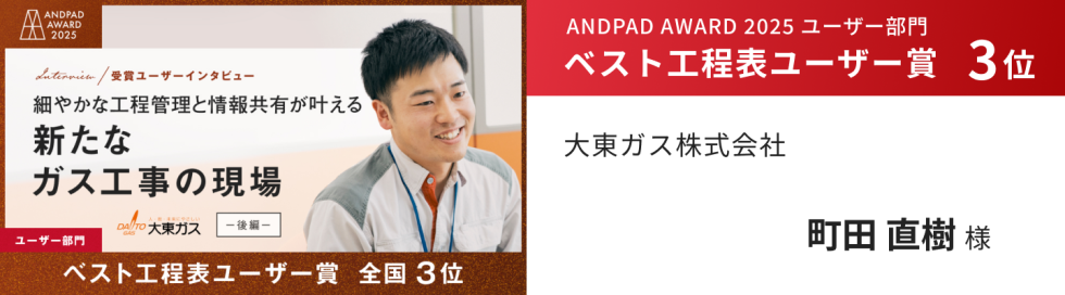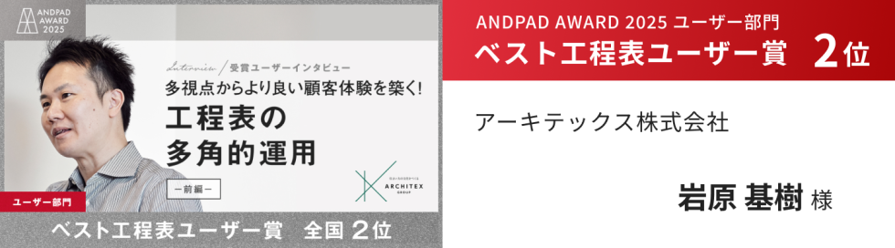 こうした便利な機能は、ANDPAD上で工程表がしっかりと作成されてこそ活かされます。各工程に担当者を設定し、工程変更があればその都度反映して、工程表のステータスも状況にあわせて変えていく。そんな工程表運用に徹底的に取り組んだユーザーを表彰します。
