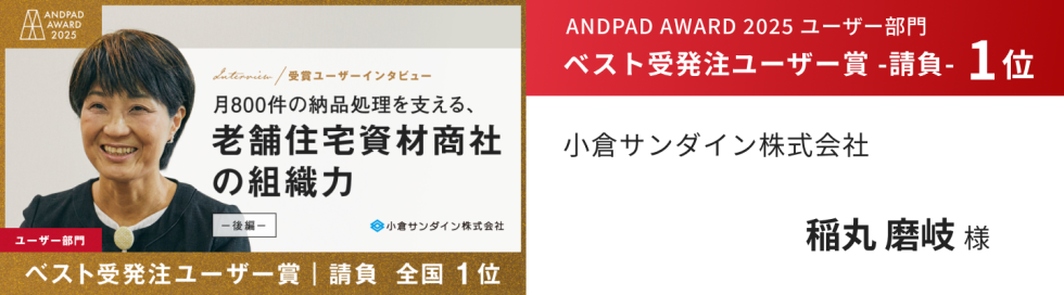 2024年の1年間を通して、日々ANDPAD受発注を通じて発注側の業務を行い、最もANDPAD受発注を活用したユーザーを表彰します。