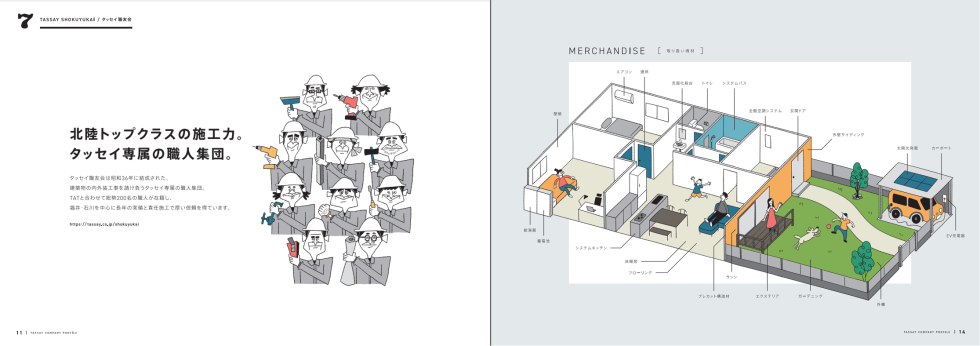 同社の会社紹介パンフレットの一部。イラストを用いて親しみやすく、わかりやすい内容で制作されている。