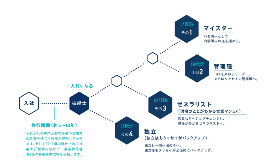 さらに、同社はTATに興味を持った学生に向けて、入社前からキャリアプランを提示している。修業期間の先にある将来像を見せることが若手のモチベーションアップにつながり、成長を促しているという。