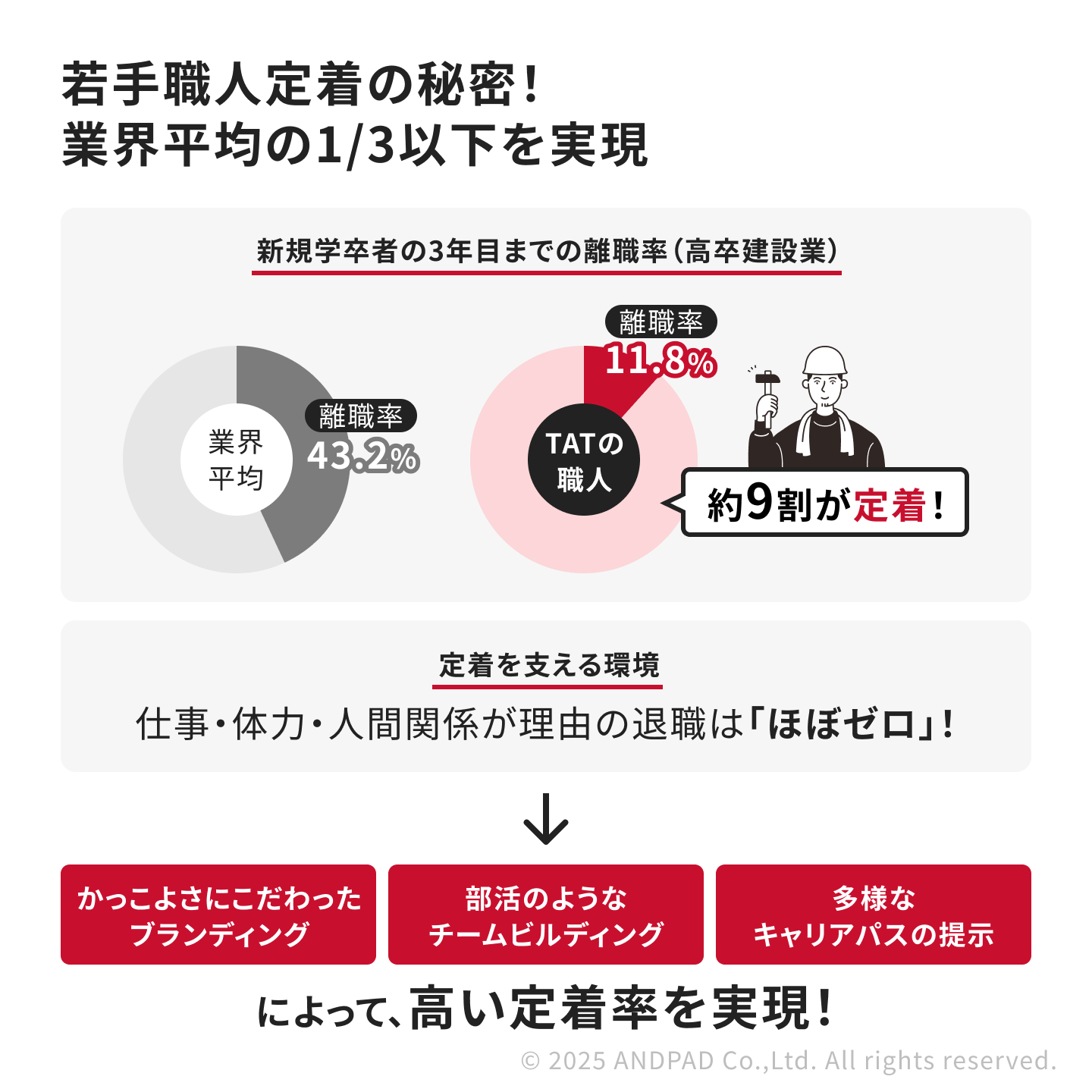 では、実際にTATの一員となった若手職人の定着率はどうなのだろうか。田中さんは、「入社3年以内の社員の離職率は11.8%。約9割の社員が定着してくれています」と誇らしげに話す。建設業全体で、新規高卒就職者の3年以内離職率が43.2%(※)であることからも、同社の定着率の高さが伺える。