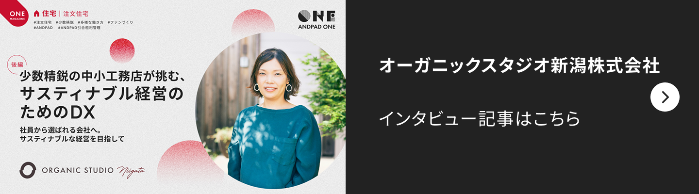 ・自然素材エコハウスの注文住宅設計・施工を行うオーガニックスタジオ新潟様は、コロナ禍を機にデジタルシフトを加速させました。ANDPADを導入し、資料などをクラウド環境で共有し一元管理。業務の効率化を図りながらテレワークを取り入れ、ライフステージの変化にも対応できる多様な働き方を実現しました。