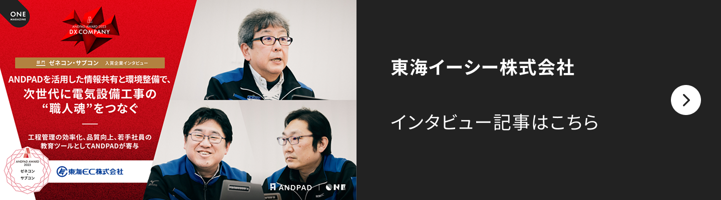 ・愛知県を拠点に全国の電気設備工事・計装工事を手がける東海イーシー様は、ライフステージの変化に合わせ、社員が時間を有効に使える環境を作るべくテレワークを導入。ANDPAD活用による資料のデジタル化で、在宅でも現場や社内と確実な情報共有が可能になりました。柔軟な働き方は、社員の会社への愛着度向上にもつながっています。