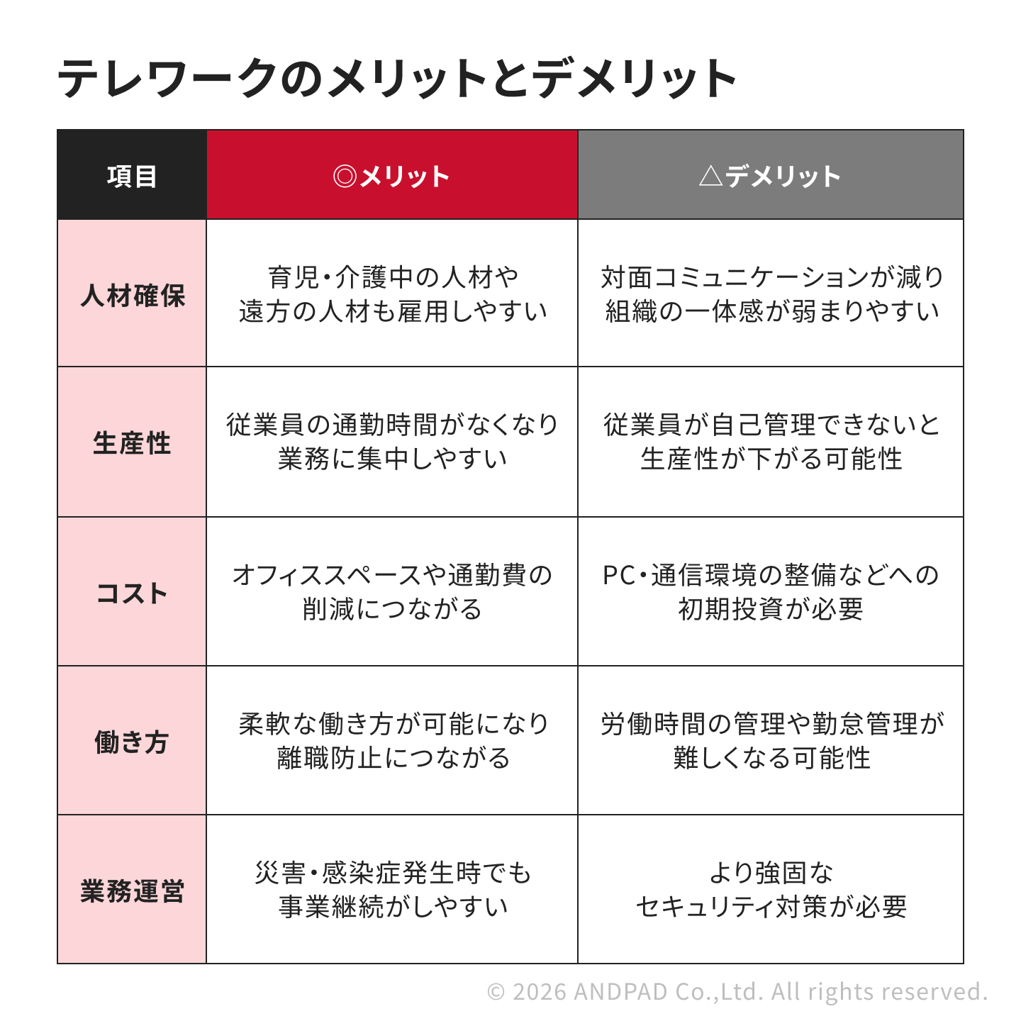 テレワークとは、会社に出勤せず、ICT(PCやインターネットなど)を活用して自宅や外出先などで働く方法です。ただし、テレワークのできない職種もありますので、自社ではどの職種がテレワークできるのか?を検討していきましょう。また、必ずしも全ての業務をテレワークにする必要はありません。事務作業や打ち合わせなど一部業務から導入することで、無理なく柔軟な働き方を実現できます。