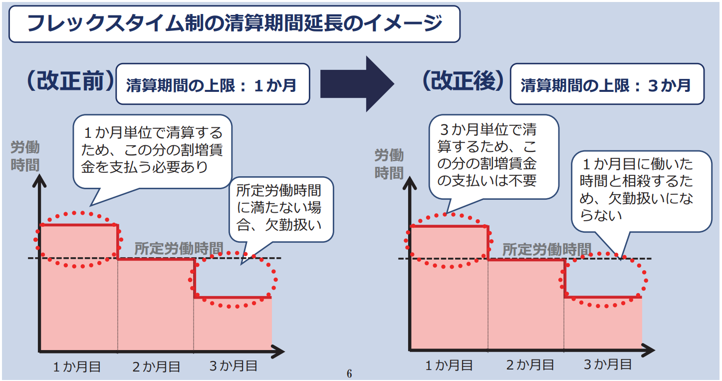 働き方改革の一環として法改正が行われ(2019年4月施行)、1か月だったフレックスタイム制の清算期間の上限が3か月に延⻑されました。これにより、より長い期間内で個人の都合に応じた労働時間の調整が可能となりました。